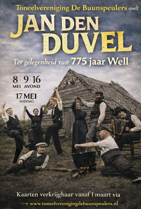Ter gelegenheid van het 775-jarig bestaan van Well brengt toneelvereniging De Buunspeulers een bijzonder en sfeervol toneelstuk op de planken. Dit keer staat het verhaal in het teken van een markante en tot de verbeelding sprekende figuur uit de Wellse geschiedenis: Jan den Duvel.