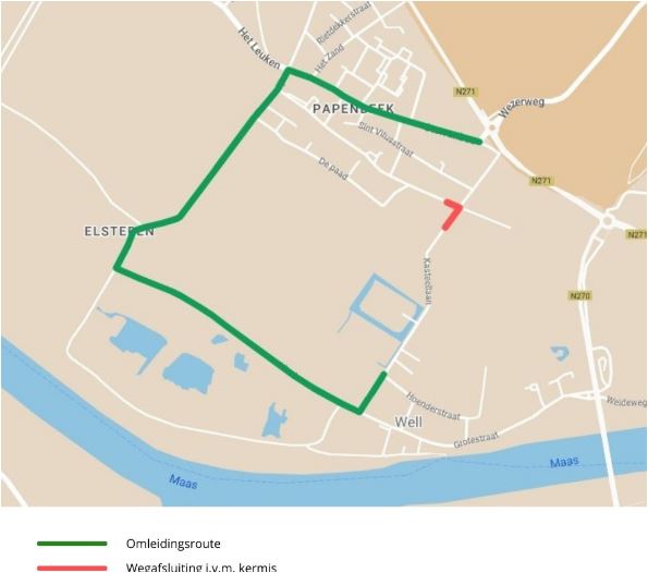 Omdat de kermis op straat komt te staan is er van 20 tot en met 28 augustus een tijdelijke wegafsluiting van kracht. Gedurende deze periode is er voor gemotoriseerd verkeer richting de oude kern van Well een omleidingsroute via Elsteren. De omleidingsroute wordt met borden langs de weg aangegeven.