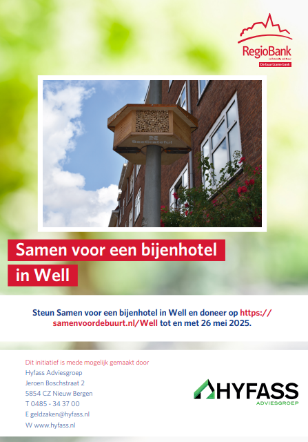 Er zijn steeds minder wilde bijen in Well, terwijl bijen heel belangrijk zijn voor de buurt. Ze helpen bloemen, planten en bomen te laten groeien en zorgen voor groenten en fruit. Crowfunding platform ´Samen voor de Buurt´ voert samen met Hyfass Adviesgroep & Zelfstandig Adviseur van RegioBank actie voor terugkeer van de wilde bij door te zorgen voor fijne woonplekken in de buurt.