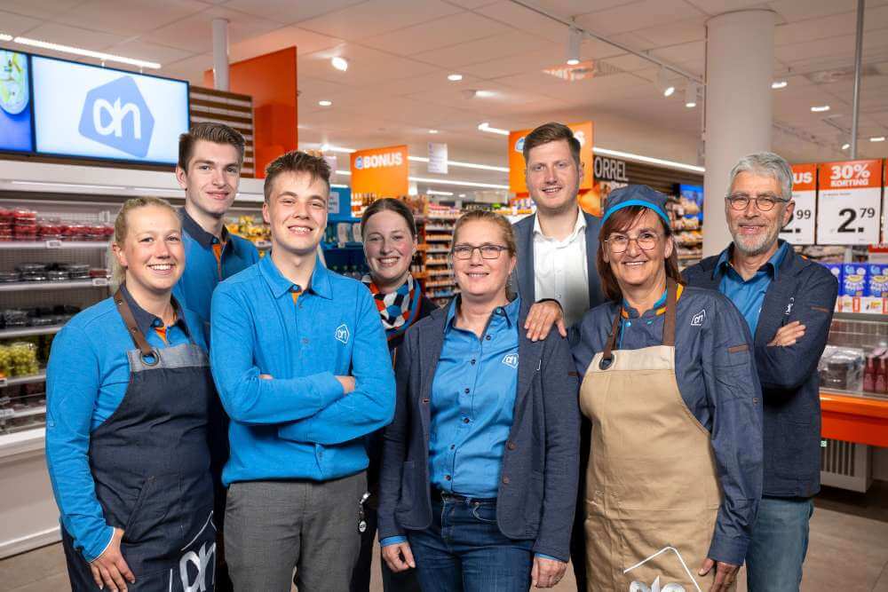 Foto: Het winkelteam uit Bergen, maar dan al in de nieuwe bedrijfskleding. Foto - Albert Heijn Jan Linders, Andries van der Ree.