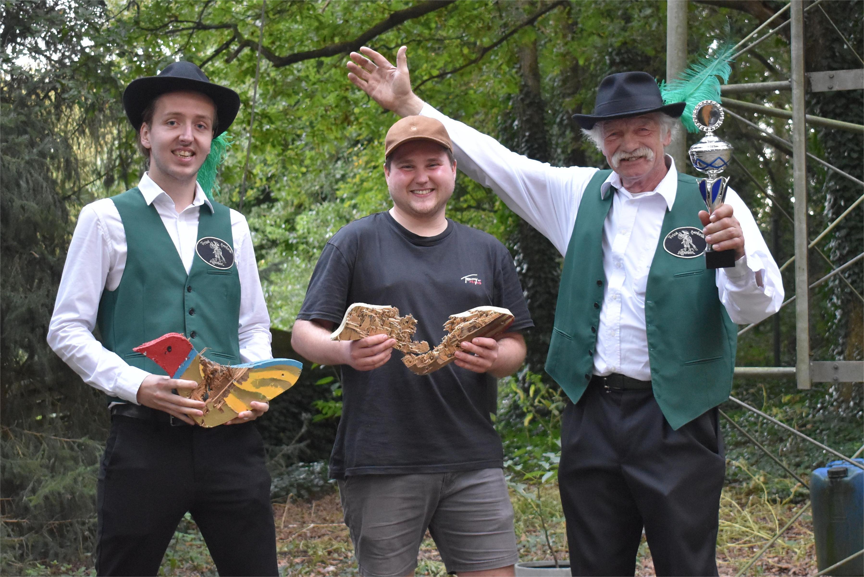 Foto: (vlnr) Vogelkoning Jesse Custers, publiekskoning Mika Wijers en koning op de wip Bert Megens.