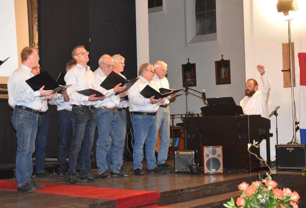 Foto: Het Grenslandmannenkoor o.lv. Marcel Engelen vorig jaar tijdens het gemeentelijk korenconcert in actie in de Offerse kerk.