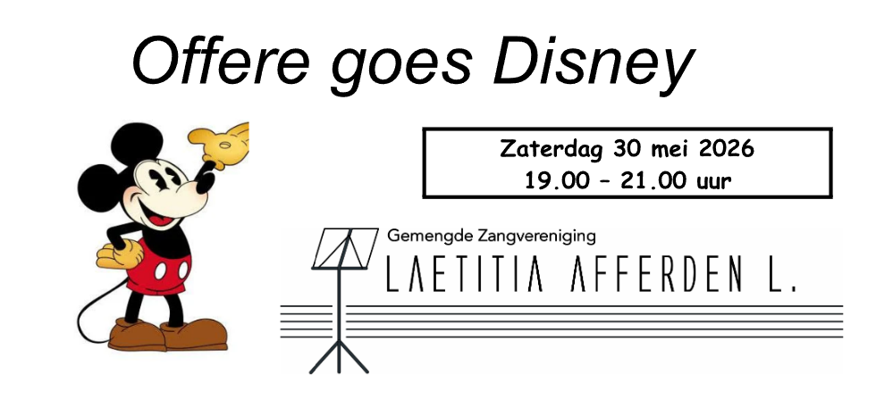 Gemengde zangvereniging Laetitia uit Offere heeft voor zichzelf een nieuwe uitdaging geformuleerd. Zaterdag 30 mei vormt de Offerse Cosmas en Damianuskerk de achtergrond van een nieuw muzikaal project onder de naam ´Offere goes Disney´. Met behulp van Offerse verenigingen wordt hier van 19.00 tot 21.00 uur een gratis muzikale show neergezet gebaseerd op het rijke film- en musicaloeuvre van Disney.