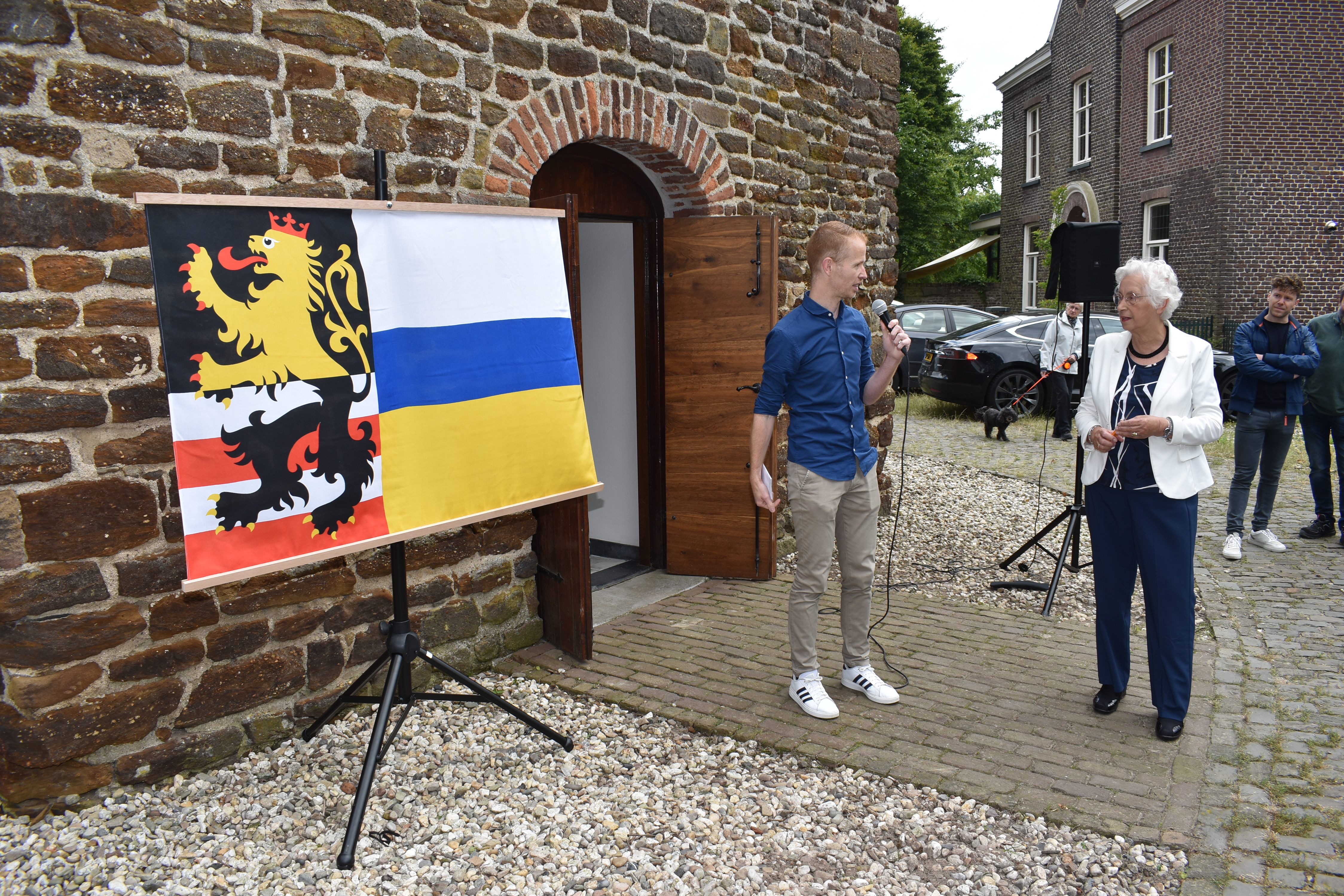 Ton Wijers van de Dorpsraad presenteerde de vlag aan de voet van de Offerse monumentale kerktoren. Voor de onthulling tekende voormalig Offerse schooljuf Tonny Burgers.
