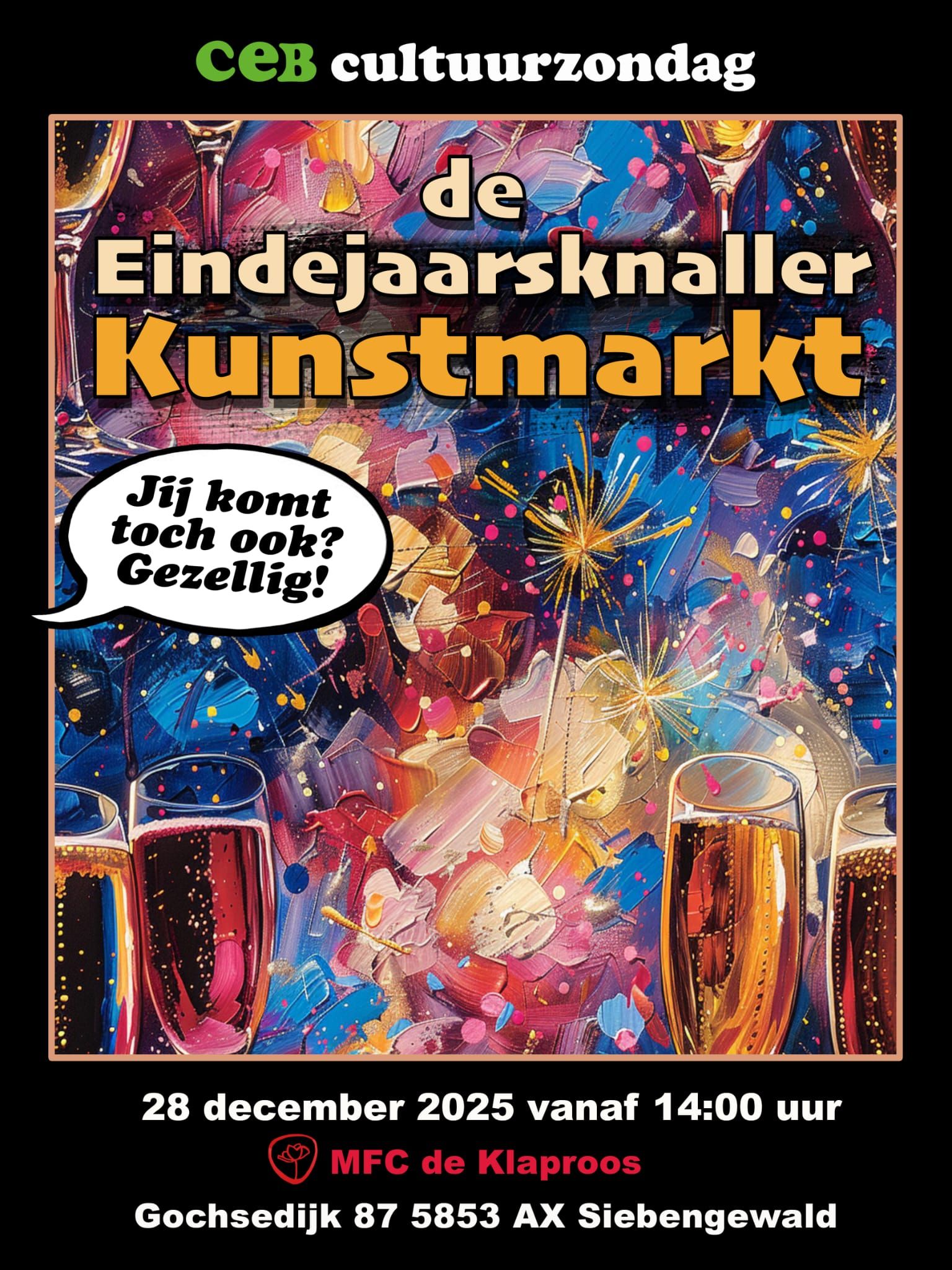 Tijdens deze Eindejaarsknaller Kunstmarkt mogen alle deelnemers van het jaar 2025 nog één keer knallen! "Zij laten je graag zien wat ze in huis hebben. Wil je een cursus volgen? Dan heb je hier de kans om te kijken of er iets voor jou bij zit! En zoals het hoort bij een eindejaarsknaller is er, naast de koffie en thee, ook warme glühwein of chocolademelk. Marcel Wahlen staat garant voor het culinair hapje van de maand: de oliebol of sneeuwbal. Ze worden ter plekke, met vakmanschap en aandacht voor smaak, gebakken! Het eerste rondje is, zoals altijd, van de CEB. Je kunt de oliebollen ook kopen om mee naar huis te nemen.''