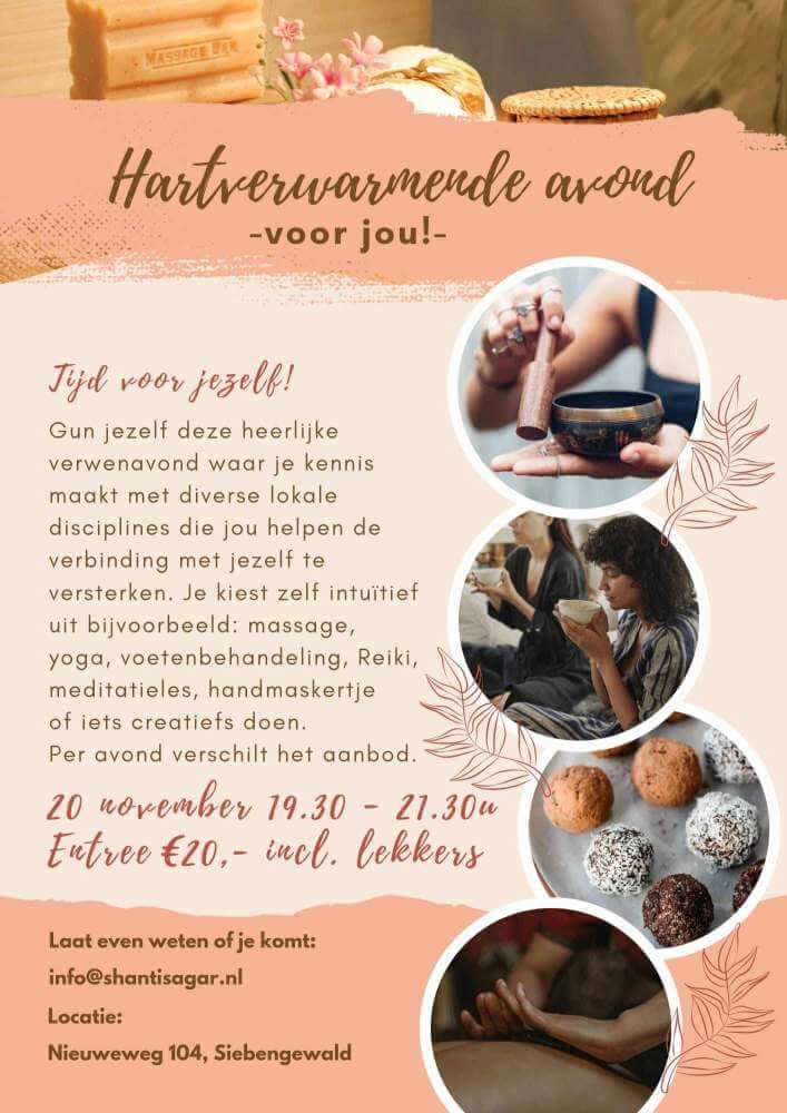 Maandagavond 20 november verzorgen enkele lokale ondernemers onder wie Chantal Heijligers, Elly van Raaij en Nicole Wijers bij Shanti Sagar aan de Nieuweweg 104 in Siebengewald een hartverwarmende avond voor jou.