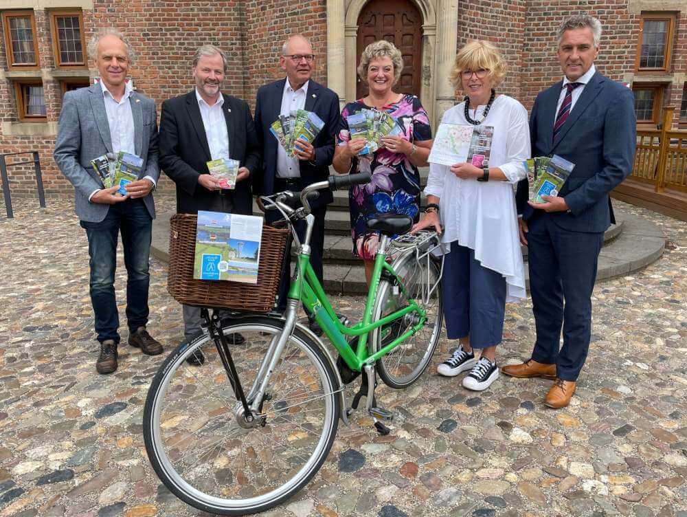 Foto: Presentatie van de zes fietsroutes door (vlnr): de heer Kamps, secretaris Euregio Rijn-Waal, burgemeester Weber (Uedem), burgemeester Knickrehm (Goch), burgemeester Pelzer (Bergen), burgemeester Schulz (Kalkar) en burgemeester Teunissen (Gennep).