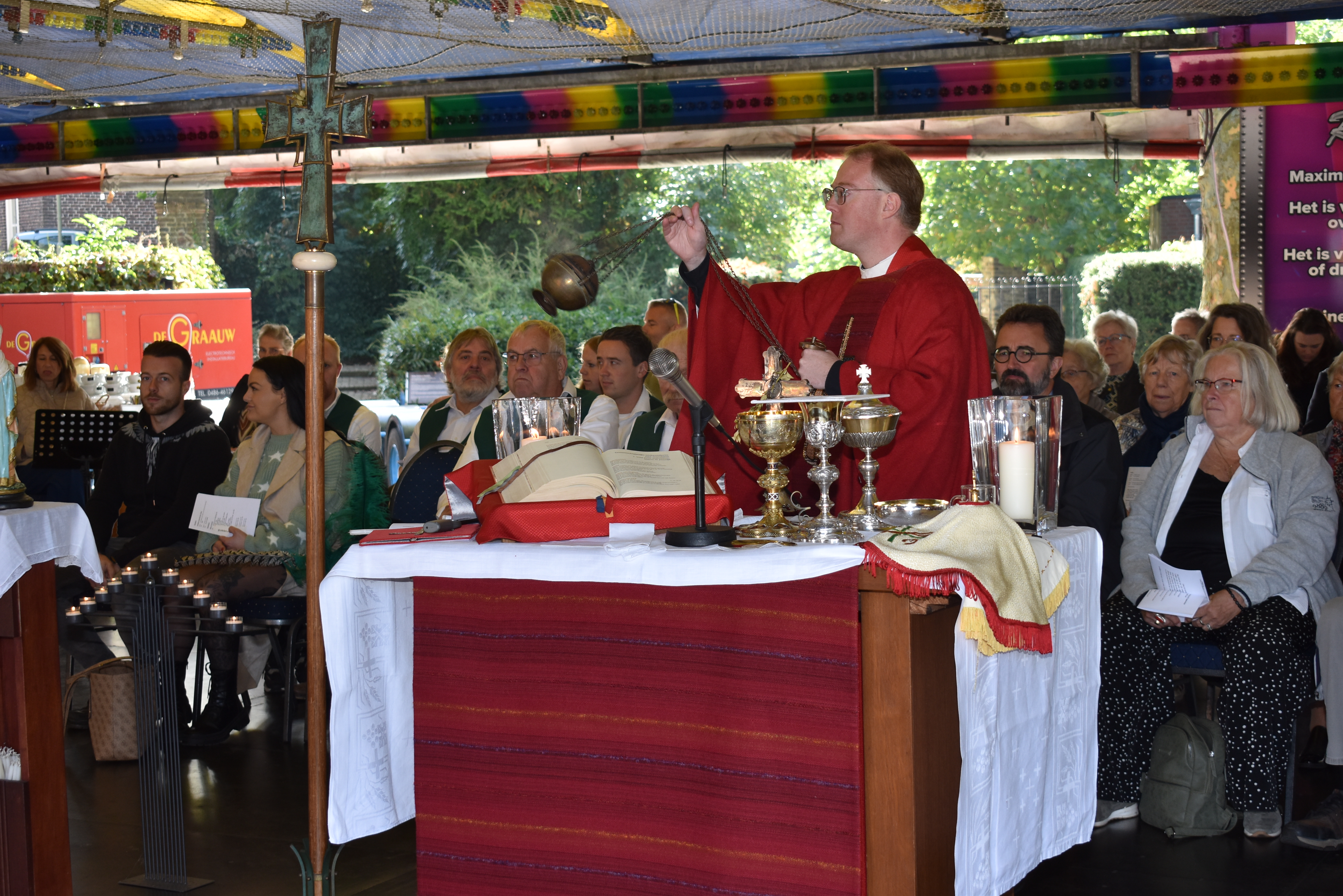 Foto: Pastoor Blom wijkt zondag 28 september voor de viering van patroonsfeest Cosmas en Damianus uit naar de grote feesttent van De Pruuver in het Heijmanspark.