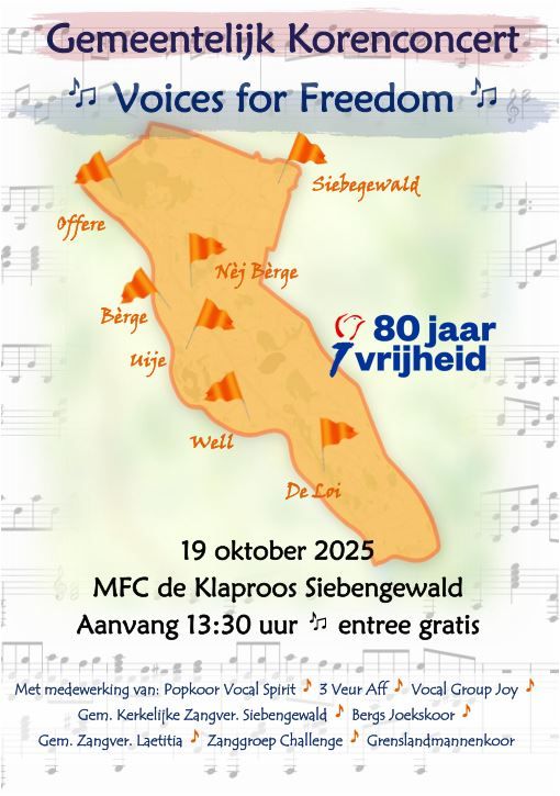 Zondag 19 oktober vindt in MFC de Klaproos in Siebengewald het gemeentelijk korenconcert 'Voices for Freedom' plaats. Dit concert wordt om de twee jaar bij toerbeurt gehouden en ligt dit jaar in handen van het Grenslandmannenkoor. Dit concert staat in het teken van '80 jaar Vrijheid' en begint om 13.30 uur. De toegang is gratis.