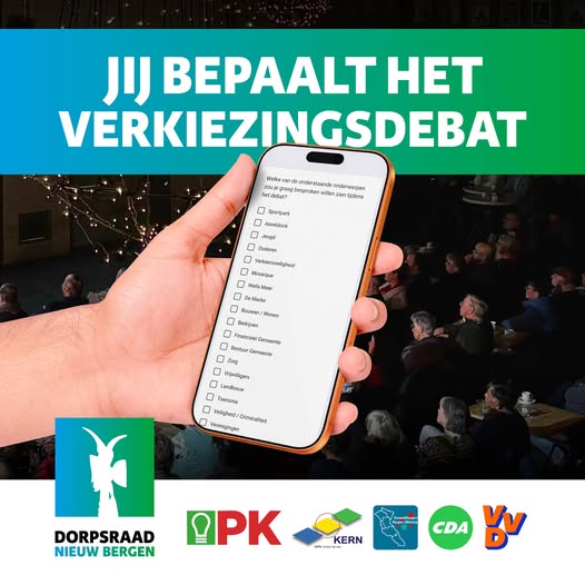 Onder begeleiding van een onafhankelijke gespreksleider krijgen deelnemende partijen de ruimte om zich voor te stellen en met elkaar in gesprek te gaan over actuele thema’s die leven in Nieuw Bergen. Daarvoor is de Dorpsraad benieuwd naar zaken die er leven onder de bewoners. Via een korte vragenlijst op https://forms.gle/cCWp7iBpyYdMk3B37 kun je maximaal vijf onderwerpen aangeven die jij belangrijk vindt.