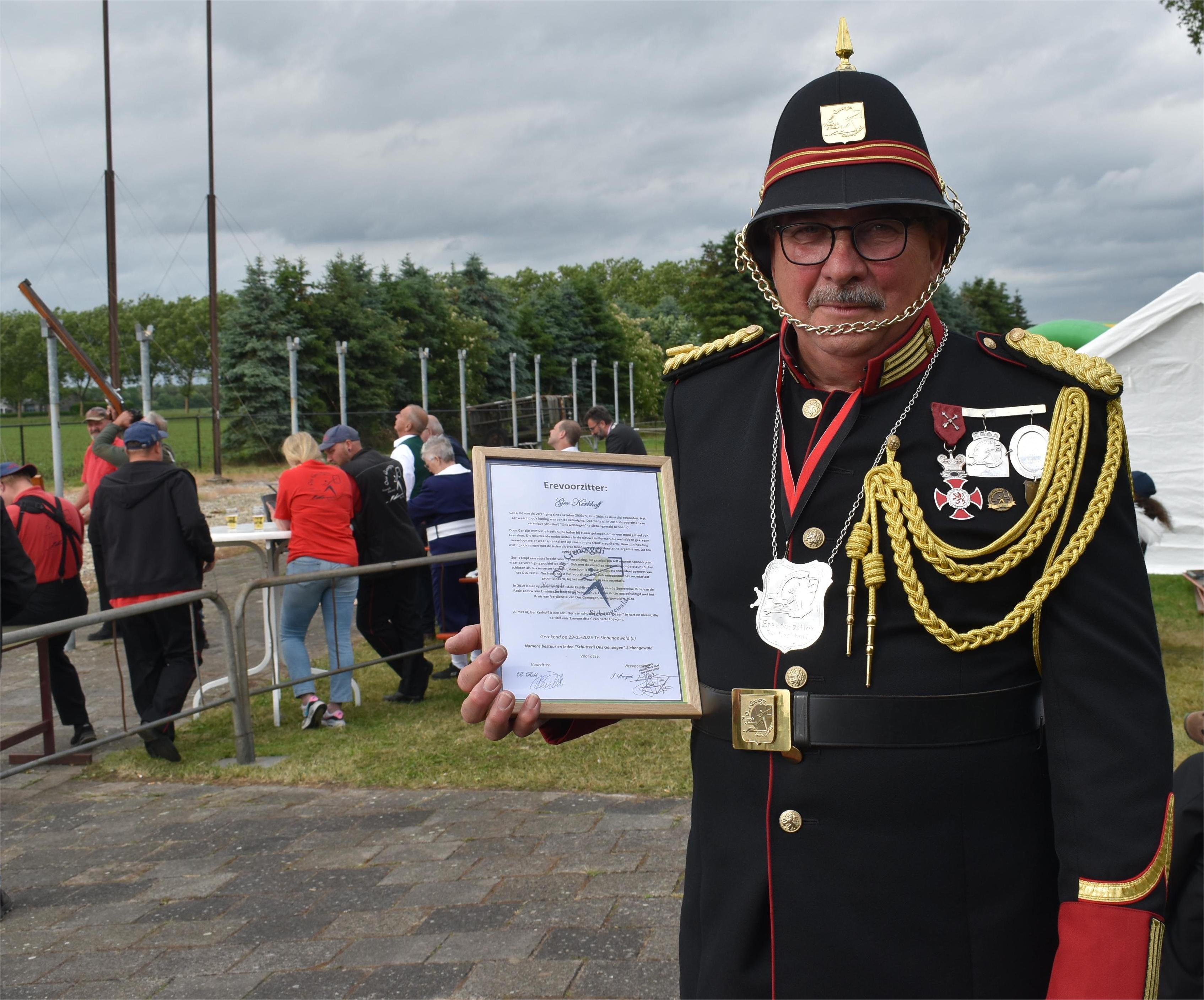 Ger Kerkhoff maakt al sinds 2006 deel uit van het bestuur, waarvan de laatste 13 jaar als voorzitter. Onder zijn leiding heeft de schutterij nieuwe uniformen gekregen en deel genomen aan diverse schuttersfeesten. Als buksmeester heeft hij ook deel uitgemaakt van het OLS-zestal. In 2019 werd Ger vanwege zijn verdiensten opgenomen in de Edele Eed-Broederschap van de Souvereine Orde van de Rode Leeuw van Limburg en de H. Sebastianus en vorig jaar nog werd hij gehuldigd met het Kruis van Verdienste van Ons Genoegen. Nu hij besloten heeft een stapje terug te doen heeft Bob Ruhl de voorzittershamer overgenomen. Een van de eerste daden van de nieuwe voorzitter was om Ger namens bestuur en leden te benoemen tot erevoorzitter van schutterij Ons Genoegen.
