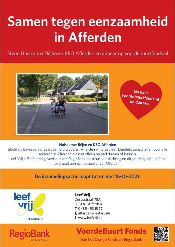 Stichting Bevordering Leefbaarheid Ouderen Afferden wil graag een duofiets aanschaffen voor alle senioren in Afferden die niet alleen op pad durven óf kunnen. Leef Vrij is zelfstandig adviseur van RegioBank en steunt de stichting en dit prachtig initiatief dat bijdraagt aan een sociaal vitaal Afferden. Ed Peters van Leef Vrij vertelt: "In 2019 introduceerde RegioBank samen met het Oranje Fonds het VoordeBuurt Fonds. Wij waren meteen enthousiast over dit project. En we vinden het erg fijn dat de stichting voor de duofiets een bijdrage uit het fonds kan krijgen. Want door leuke activiteiten en sociaal contact wordt eenzaamheid voorkomen. Wij dragen de ouderen van Afferden een warm hart toe en helpen graag bij het ophalen van het resterende benodigde bedrag. Het is mooi dat inwoners van Afferden naar elkaar omkijken en om elkaar geven."