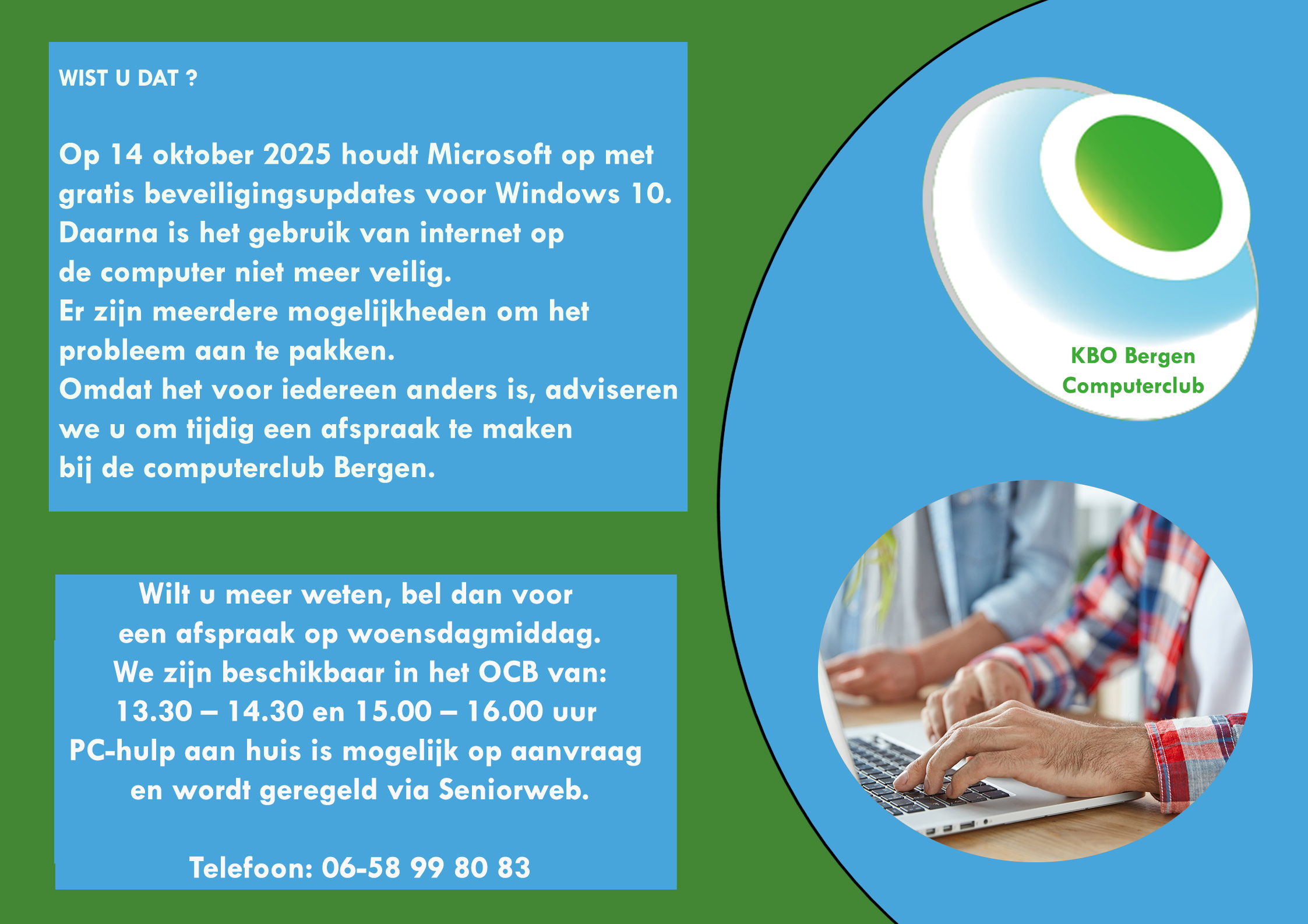 Computerclub Bergen houdt iedere woensdagmiddag spreekuur van 13.30 – 14.30 en 15.00 – 16.00 uur in het OCB in Nieuw Bergen. PC-hulp aan huis is mogelijk op aanvraag en wordt geregeld via Seniorweb.