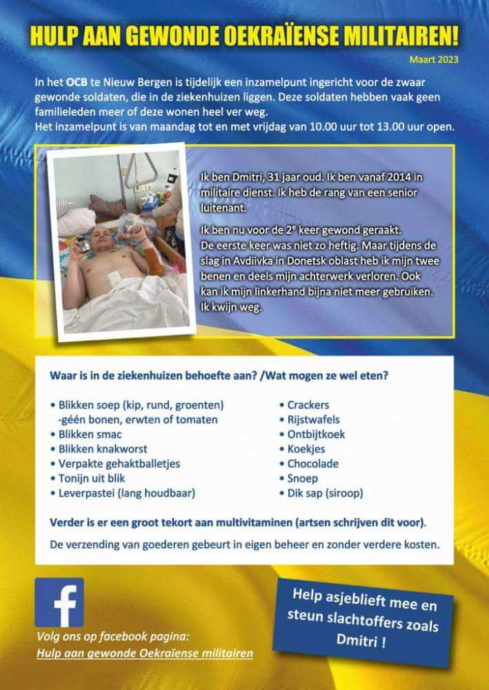 Kijk voor meer informatie op facebookpagina hulp aan gewonde Oekraïense militairen.