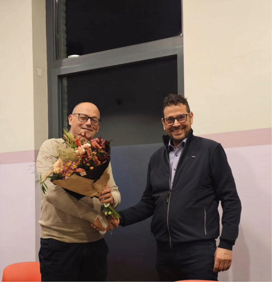 Foto: Afdelingsvoorzitter Maurice Linders (rechts op foto) overhandigt een bos bloemen aan de nieuwe lijsttrekker van CDA Bergen John Cornelissen.