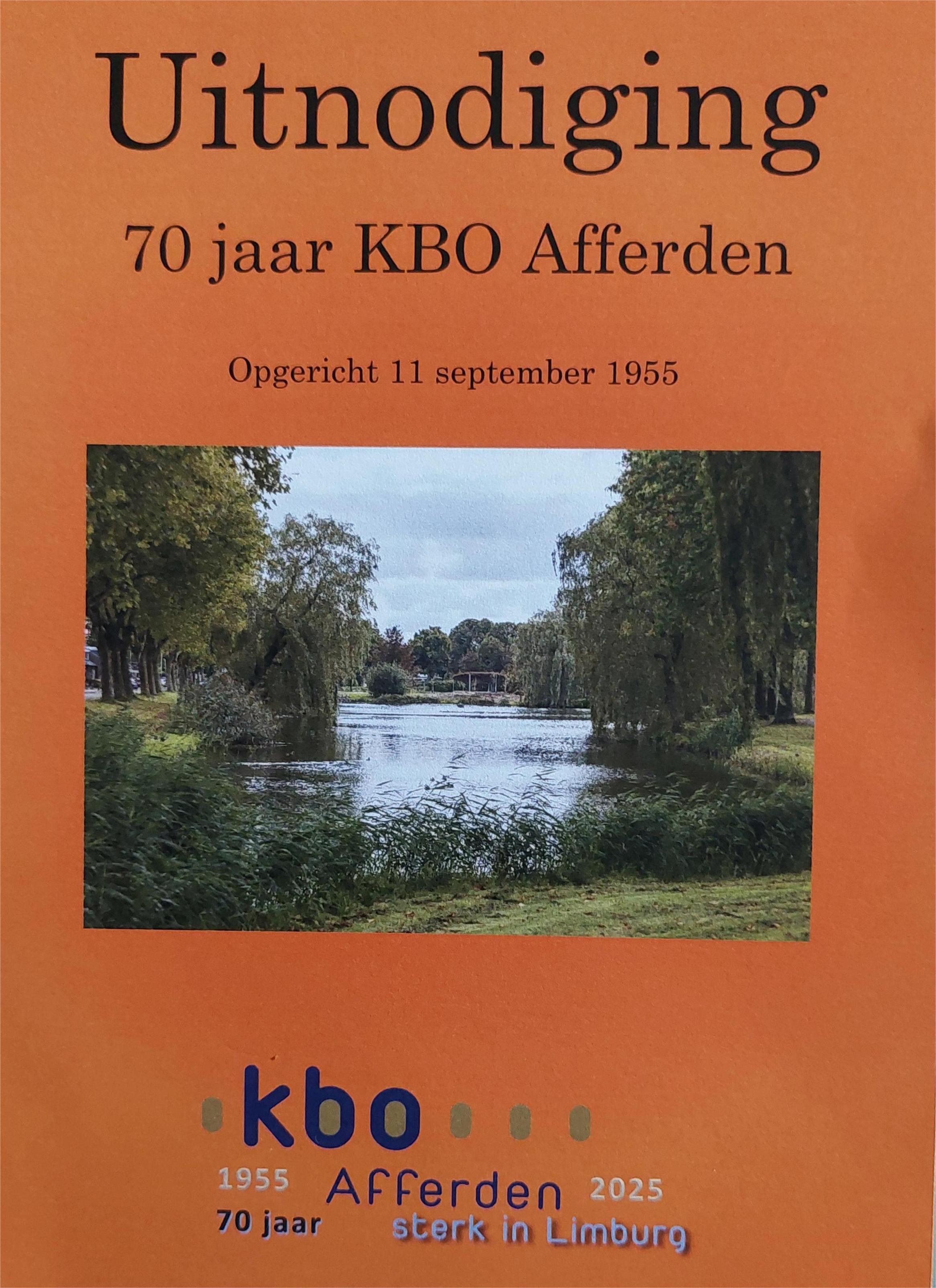 Zaterdag 25 oktober 2025 staat KBO Afferden op feestelijke wijze stil bij haar 70-jarig bestaan. Dit jubileumfeest vindt plaats van 14.00 tot 22.30 uur in de Alverman waar de leden worden getrakteerd op entertainment, een heerlijk buffet en fijne muziek.