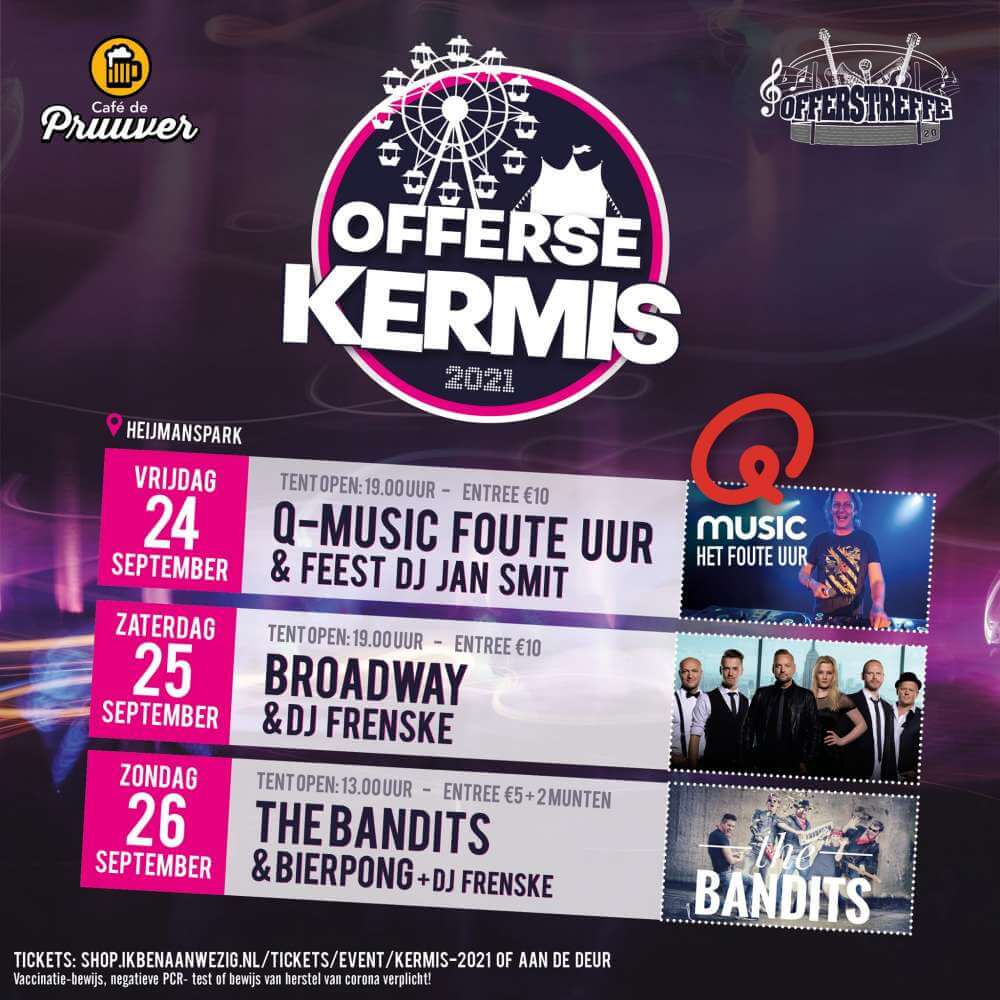 Voor Luke van café De Pruuver was al snel duidelijk dat met inachtneming van de geldende coronamaatregelen de eigen zaal veel te klein zou zijn voor een muzikaal kermisprogramma. De oplossing zou het plaatsen van een grote tent zijn nabij het kermisterrein in het Heijmanspark. Daarvoor was wel samenwerking nodig met een andere partij die gevonden is in stichting Offers Treffe 2.0. Het resultaat is een knallend feestprogramma dat vrijdagavond 24 september groots wordt afgetrapt met Q-Music foute uur en feest-dj Jan Smit. Zaterdagavond 25 september staat een spetterende show met topformatie Broadway op het programma en tevens een optreden van de Offerse dj Frenske. Zondag 26 september begint vanaf 14.00 uur het grote bierpongtoernooi met muziek van eveneens de Offerse dj Frenske. Het muzikale kermisprogramma wordt zondag afgesloten met een optreden van feestband The Bandits.
