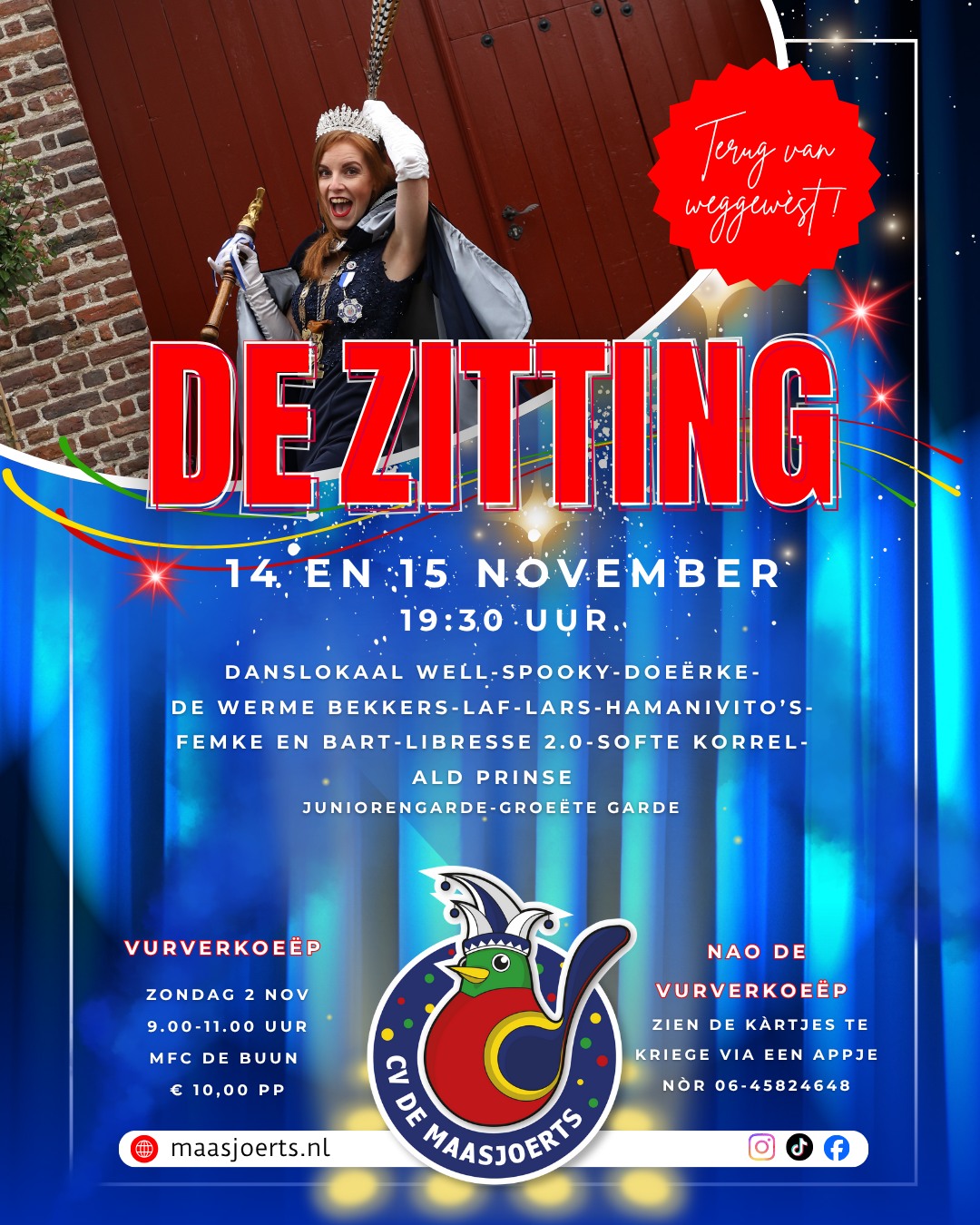 Een groep enthousiaste vrijwilligers nam in maart 2025 het initiatief om de zitting nieuw leven in te blazen. En dat is gelukt! Men is er in geslaagd een volledig programma met een mix van buutreedners, dansgardes, zangacts en sketches samen te stellen. Dankzij deze lokale artiesten biedt de Maasjoertse zitting 2.0 op 14 en 15 november een avond vol afwisseling en humor. Kaartjes à 10 euro p.p. zijn in de voorverkoop op zondag 2 november tussen 9.00 en 11.00 uur in De Buun verkrijgbaar. Na de voorverkoop via een appje naar 06-45824648.
