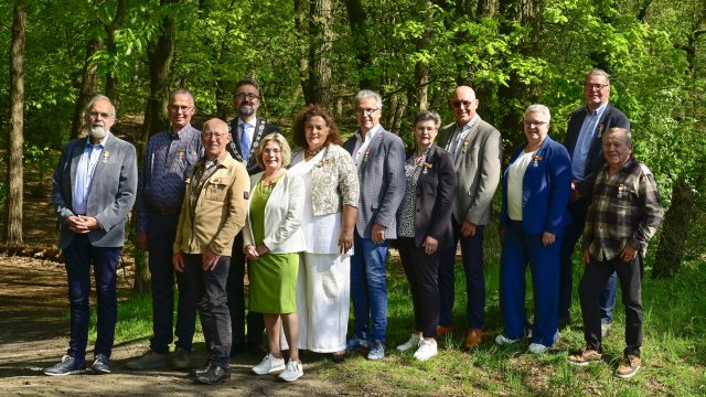 Foto: De gedecoreerden van de lintjesregen 2025, met burgemeester Michael Rauner. Op de foto ontbreken: Jan Heijkoop-Reijners en Raymund Swertz. (foto Gemeente Bergen)