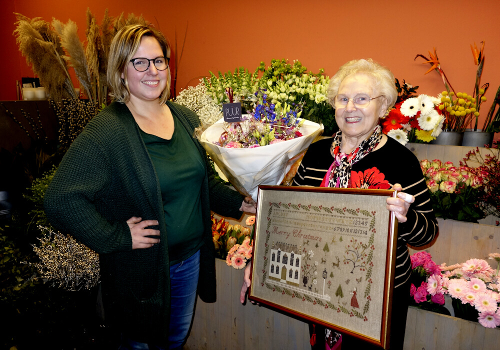 Petra Gerritsen (1946) borduurt al zo'n 40 jaar met veel passie en plezier. Haar inzending van ' meest exclusieve kerstdecoratie' betreft een ontwerp van de Amerikaanse Stacy Nash, getiteld: 'Christmas at Hollyberry Farm'. Je kunt het ontwerp op een merklap bestellen en dan hoef je het 'alleen nog maar even te borduren'. Maanden tijd zit erin.