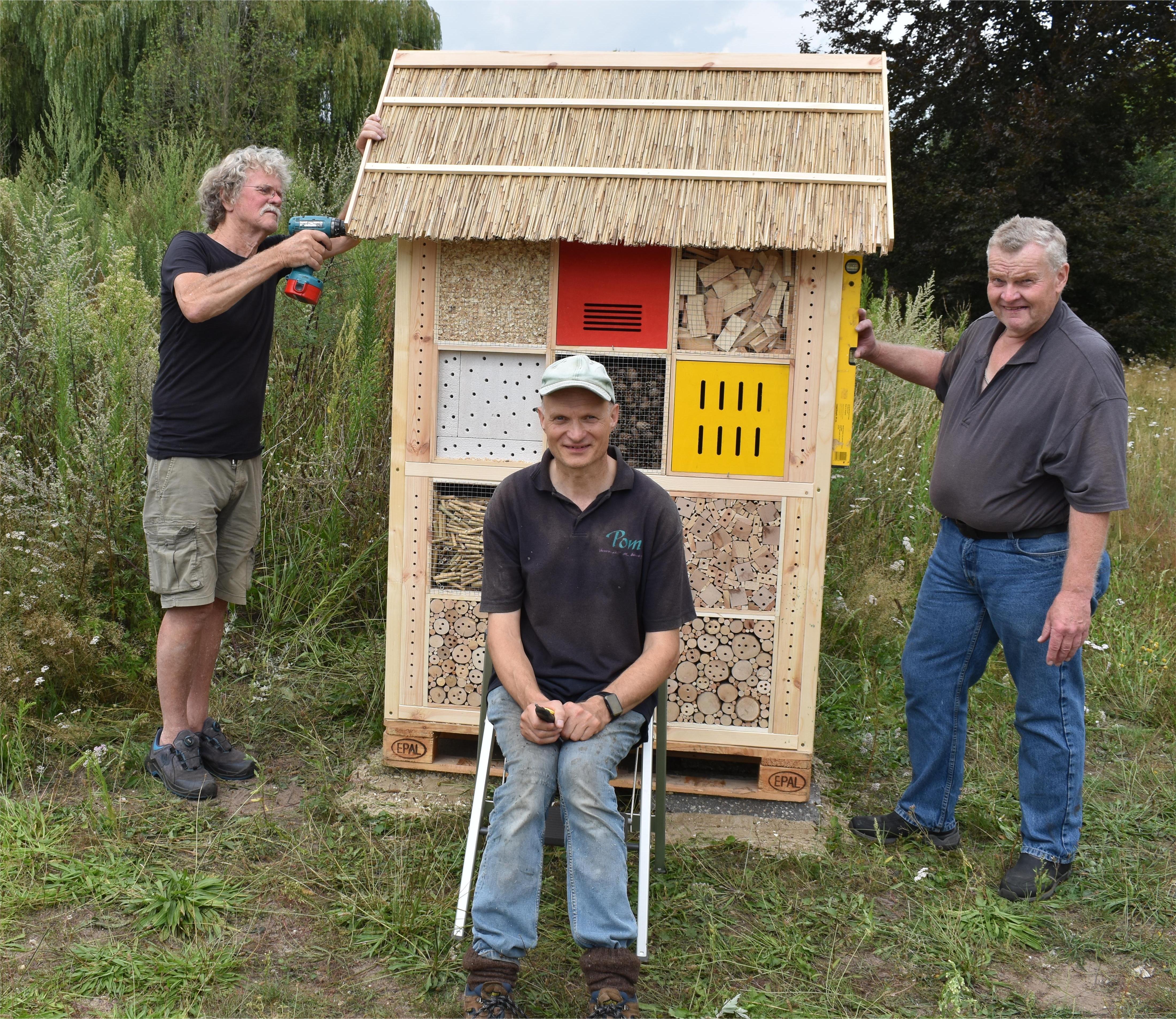 Het insectenhotel in het Heijmanspark is niet alleen een flink exemplaar maar ook een prijzige voorziening. ''Het heeft een flinke rib uit ons lijf gekost'', verzekert Hendriks, terwijl hij samen met dorpsraadleden Piet Manders en Pierre Kempen de laatste hand aan het gevaarte verricht. Aan vier zijden kunnen insecten zich nestelen in de vele materialen waarmee het insectenhotel gevuld is. Ter verfraaiing van de onderzijde van het hotel moeten nog enkele stenen worden geplaatst. Ook een bordje waarop aangegeven wordt dat de Offerse Dorpsraad de schenker is van deze insectenwoonplaats mag zeker niet ontbreken. Blijft alleen nog even de vraag wanneer de officiële opening van het Heijmanspark zal plaatsvinden en of er nog ergens een naambord in het park komt. De naam Heijmanspark is voor de inwoners uit Afferden wel bekend maar niet voor de vele duizenden toeristen die jaarlijks het dorp aandoen.
