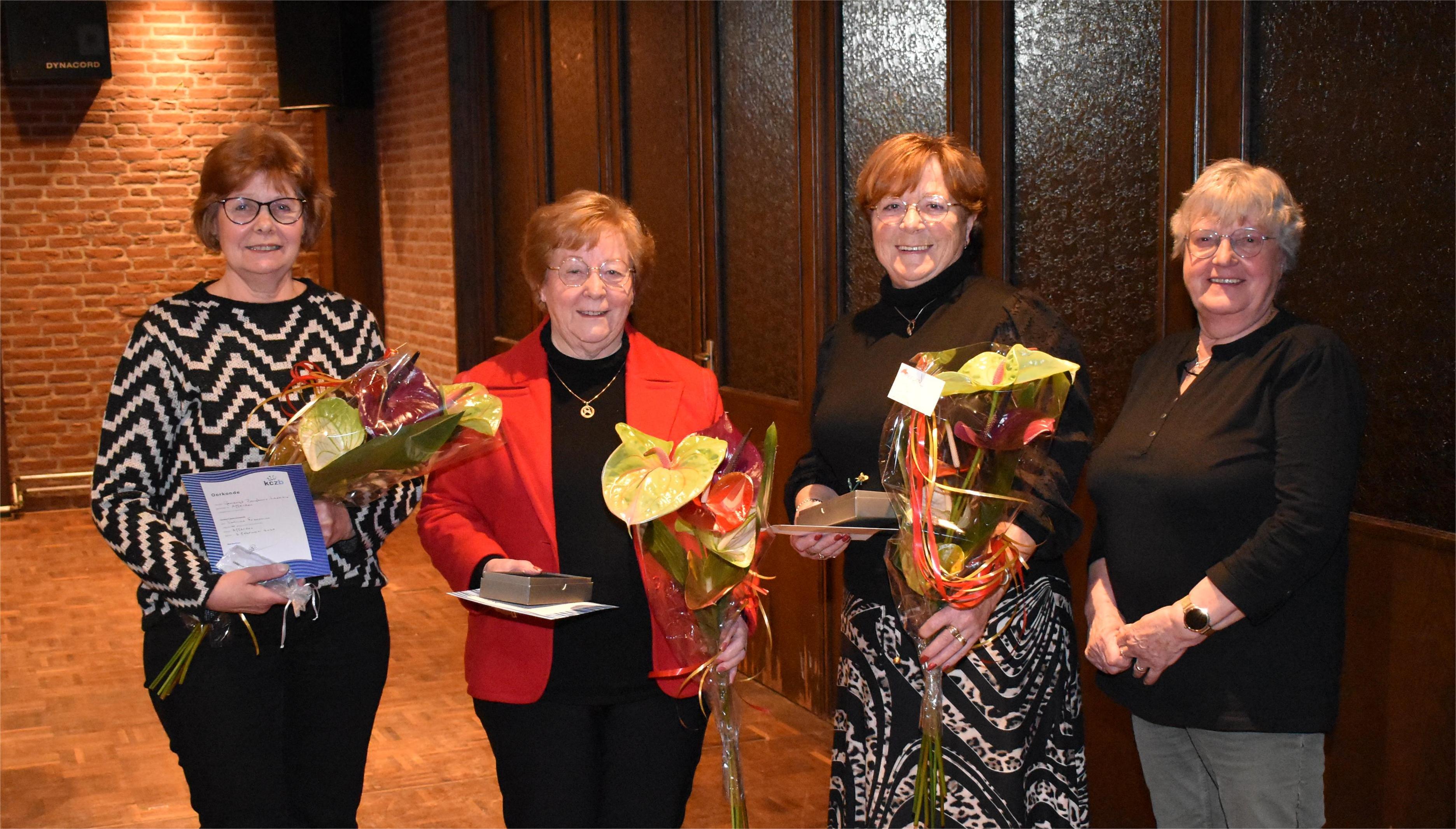 Drie jubilarissen bij Laetitia: (vlnr) Lidwien Fransman, Wies van Mil en Annie Rutten. Helemaal rechts voorzitter Hennie van Hoof.