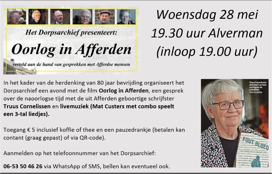 Het Dorpsarchief in Afferden gaat in het kader van de herdenking 80 jaar bevrijding in De Alverman de film 'Oorlog in Afferden' vertonen. Dat gebeurt op woensdag 28 mei vanaf 19.30 uur. (inloop vanaf 19.00 uur). Tevens wordt die avond een gesprek aangegaan met de in Afferden geboren Truus Cornelissen over het naoorlogse Afferden. De avond wordt muzikaal omlijst door Mat Custers met combo. Toegang bedraagt 5 euro inclusief koffie of thee en een drankje met de pauze.