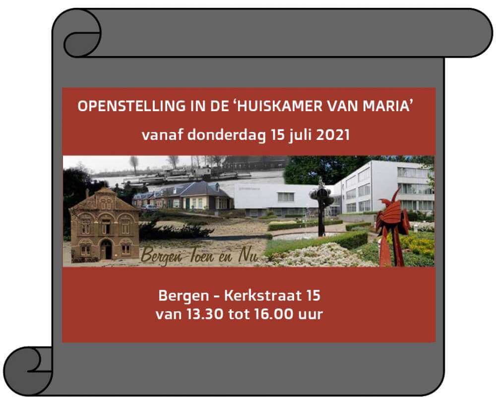 Na de coronasluiting, is Bergen Toen en Nu vanaf donderdag 15 juli 2021 voor iedereen te bereiken in de ‘Huiskamer van Maria’. Plaats: ‘De Mariaschool’ te Bergen - Kerkstraat 15 Tijd: van 13.30 tot 16.00 uur. Reeds in september 2020 heeft de werkgroep 'Bergen Toen en Nu' zijn intrek genomen in dit gebouw. De officiële opening is al een keer uitgesteld, maar deze staat nu gepland voor half augustus 2021. Bericht hierover volgt later.