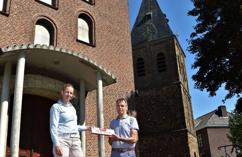 Gedurende twee zaterdagen en een halve maandag werd in de kerk gevaccineerd. Vrijwilligers van Steunpunt Afferden verleenden daarbij assistentie. Na afronding besloot Huisartsenpraktijk Afferden het kerkbestuur te bedanken met een grote doos chocolaatjes van Merci. Dat gebeurde afgelopen maandag op de kerktrappen van de Cosmas en Damianuskerk waar Wim Bendermacher van het kerkbestuur het bedankje van Saskia Benthem in ontvangst nam.