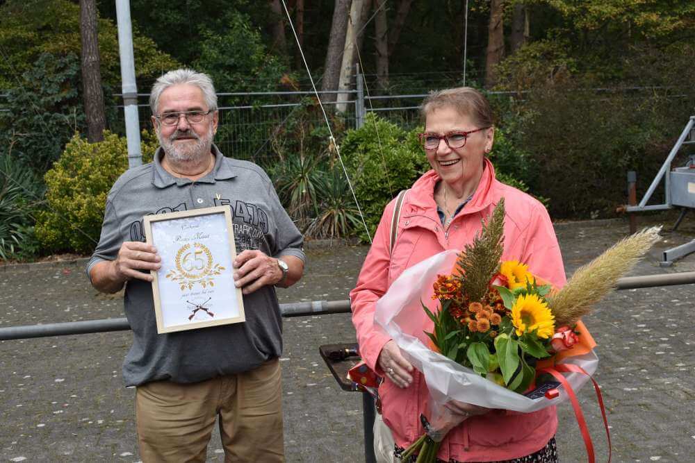 Rinus is namelijk 65 jaar lid van de schutterij waarvan 15 als vaandeldrager en 50 jaar als commandant. Hij ontving van voorzitter Daniël Kersten een mooie oorkonde en een cadeaubon. Zijn vrouw Alie kreeg een mooie bos bloemen.