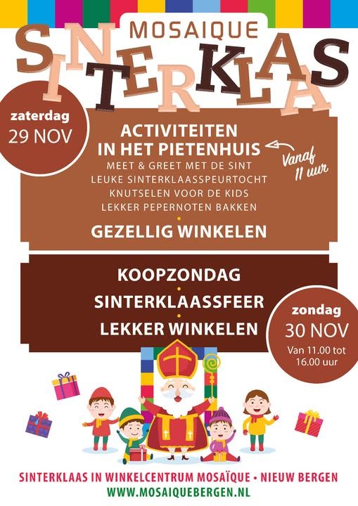 Sinterklaas brengt zondag 30 november een bezoek aan winkelcentrum Mosaïqu in Nieuw Bergen.