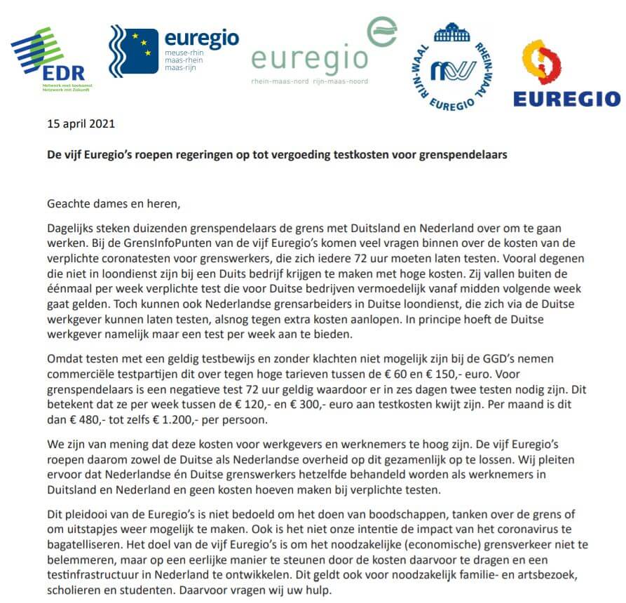 We zijn van mening dat deze kosten voor werkgevers en werknemers te hoog zijn. De vijf Euregio’s roepen daarom zowel de Duitse als Nederlandse overheid op dit gezamenlijk op te lossen. Wij pleiten ervoor dat Nederlandse én Duitse grenswerkers hetzelfde behandeld worden als werknemers in Duitsland en Nederland en geen kosten hoeven te maken bij verplichte testen. Dit pleidooi van de Euregio’s is niet bedoeld om het doen van boodschappen, tanken over de grens of om uitstapjes weer mogelijk te maken. Ook is het niet onze intentie de impact van het coronavirus te bagatelliseren. Het doel van de vijf Euregio’s is om het noodzakelijke (economische) grensverkeer niet te belemmeren, maar op een eerlijke manier te steunen door de kosten daarvoor te dragen en een testinfrastructuur in Nederland te ontwikkelen. Dit geldt ook voor noodzakelijk familie- en artsbezoek, scholieren en studenten. Daarvoor vragen wij uw hulp.
