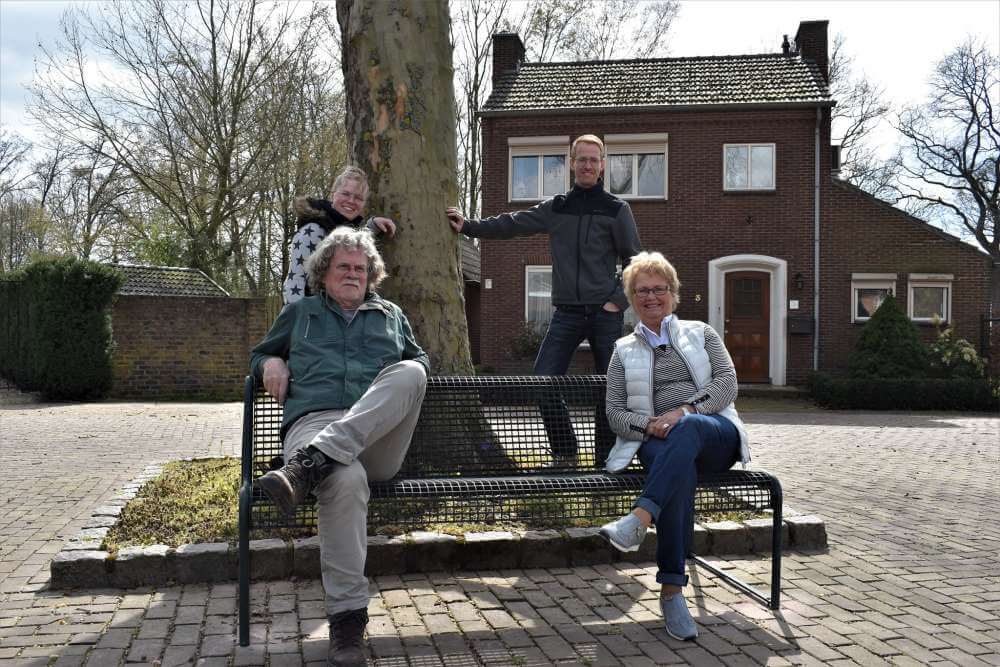 Foto: Kerkpleinbewoonsters Elly Arts en Saskia Boetselaers zijn blij met het 'nieuwe' bankje. Na plaatsing namen Dorpsraadslid Henk Hendriks en initiatiefneemster Elly Arts het bankje meteen in gebruik. Achter het bankje Saskia Boetselaers en Dorpsraadslid Ton Wijers.