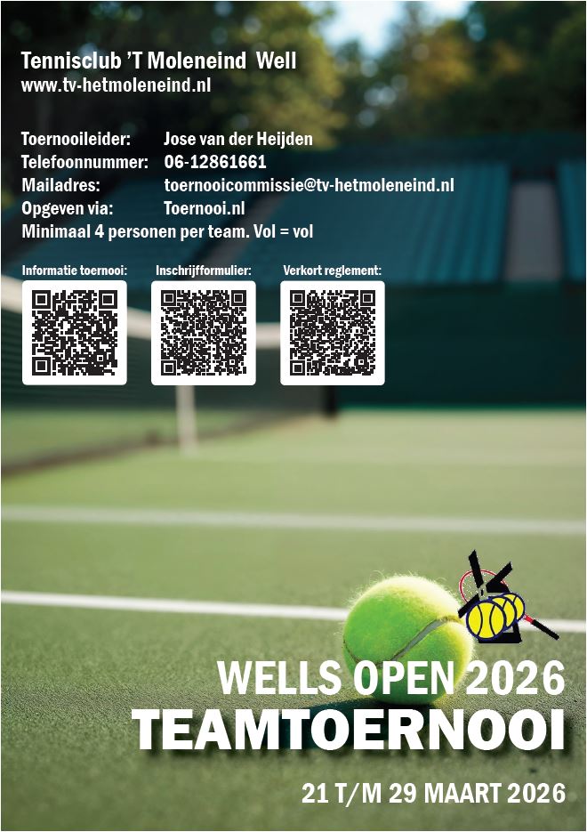 De toernooicommissie van de Wellse tennisclub heeft na dit besluit niet stil gezeten en inmiddels de voorbereidende werkzaamheden voor dit Wells open teamtoernooi afgerond en de inschrijving geopend. Ieder lid van de KNLTB kan meedoen en de inschrijfkosten per team bedragen 55 euro. Ieder team bestaat minimaal uit 4 personen en er is plaats voor maximaal 24 teams die in de week van 21 t/m 29 maart de sportieve strijd met elkaar aangaan op de tennisbanen van de Wellse tennisclub. Er wordt gespeeld volgens een bepaald poulesysteem waardoor je tegen elke tegenstander dubbelpartijen speelt. Dit betekent dat je meerdere keren op de baan staat. Hierna wordt de spanning opgevoerd via een afvalsysteem dat moet leiden tot een mooie finale. Voor de finalisten liggen er mooie prijzen te wachten. Inschrijven kan tot 8 maart via toernooi.nl