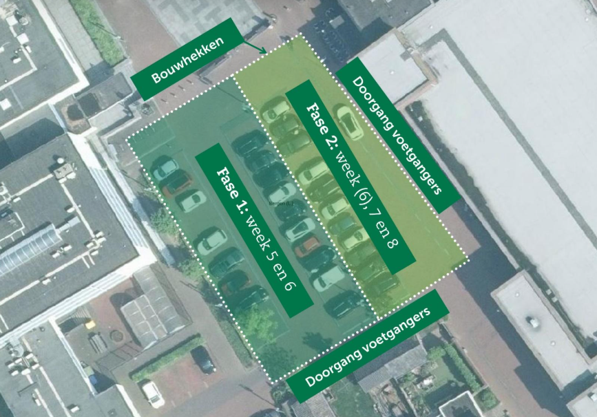 De werkzaamheden worden uitgevoerd in twee fases. Op bijgaande afbeelding is te zien u welk stuk van de parkeerplaats in welke periode niet beschikbaar is. De werkzaamheden in fase 2 starten pas op het moment dat de werkzaamheden in fase 1 klaar zijn. De twee fases zullen dus niet op hetzelfde moment afgesloten zijn. Naar verwachting nemen de werkzaamheden ongeveer vier weken in beslag. Dit is onder andere afhankelijk van de weeromstandigheden.