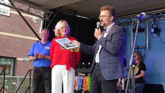 Wethouder Claudia Ponjee heeft burgemeester Michael Rauner zaterdag 1 juni verrast met het eerste exemplaar van het kunstboekje “Kunst in Bergen”. De wethouder overhandigde hem het boek tijdens de eerste editie Playa op ’t Plein op Mosaïque in Nieuw Bergen.