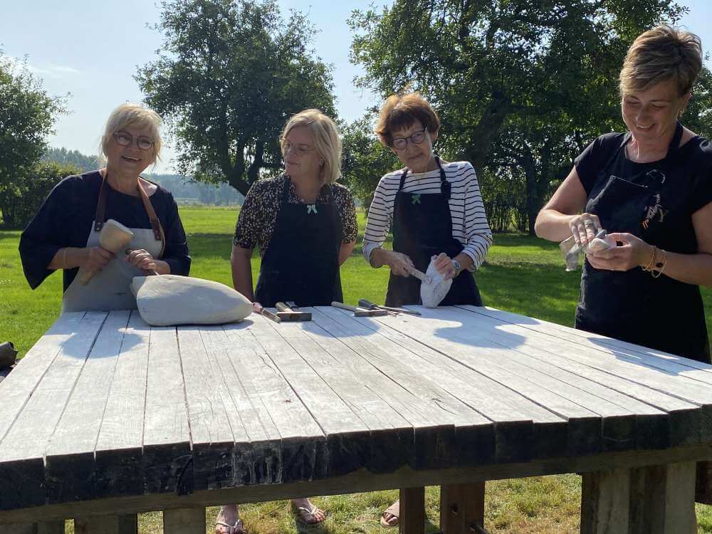 Tonnie Martens geeft het woord aan een enthousiaste deelneemster aan een eerdere workshop en goede vriendin. “Tonnie is de perfecte gastvrouw. Zij zorgt voor ontvangst met koffie en wat lekkers. De gasten ervaren kort na aankomst de schoonheid van de omgeving.” Eenmaal geacclimatiseerd gaan de cursisten aan de slag onder begeleiding van Tonnie en Marloes Holtermans . “Een workshop voelt als vakantie. In samenspraak met Tonnie en Marloes wordt besproken wat je wilt maken. De groepen werken als het even kan in de buitenlucht in de boomgaard. Tonnie geeft tips en aanwijzingen en langzaam vordert het werk. De sculptuur wordt aan het einde van de dag op een sokkel geplaatst. Je gaat altijd met een kunstwerk naar huis”, zegt de cursiste. “De dag wordt afgesloten met een borrel en een hapje op het terras.