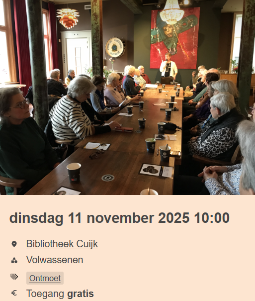 Oogcafé Land van Cuijk, dinsdag 11 november, Bibliotheek Cuijk, Grotestraat 62, 10.00 –12.00 uur, inloop vanaf 9.30 uur. Deelname gratis. www.biblioplus.nl