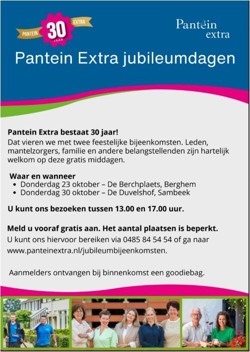 Aanmelden is gratis. Bel 0485-845454 of meld u aan via www.panteinextra.nl/jubileumdagen.
